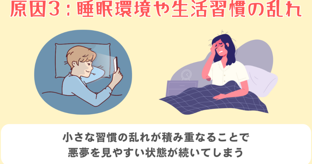 - 不規則な就寝時間:毎晩異なる時間に寝ることで、生体時計が狂い、熟睡できなくなる。